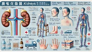 まず、腎臓の機能低下により、血液中の余分な水分や塩分の排出が滞り、足首やくるぶし周辺の腫れぼったさ、起床時の顔や手のむくみなどがみられ、長時間の座位、過剰な塩分摂取、アルコールの摂取もむくみを助長するため、注意が必要です。