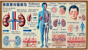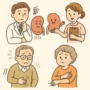 腎機能が落ちれば、むくみ、疲労、皮膚トラブル、頻尿・乏尿といったサインが現れ、進行すると高血圧や動脈硬化、心疾患、糖代謝の乱れなど多くの合併症につながります。