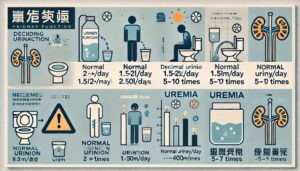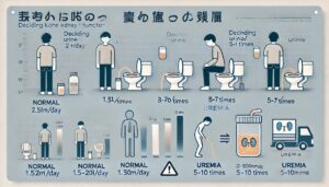 反対に、腎機能がさらに低下すると「乏尿(ぼうにょう)」や「無尿」と呼ばれる状態に陥ることがあります。
