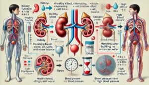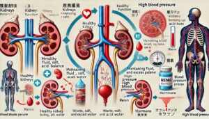 代表的なのが高血圧で、腎臓は血圧を調整するレニンというホルモンを分泌しており、腎機能が落ちると血圧を適切にコントロールできなくなります。